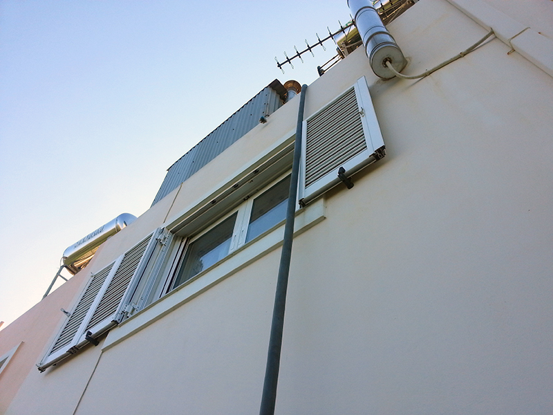 Das Befüllen des Tanks war allerdings nicht so ohne. Das Boiler-Haus ist auf dem Dach absolut ungünstig platziert und nur über den Garten hinter dem Haus erreichbar. Dorthin kann man mit dem Tankwagen aber nicht fahren. Also zog Nikos ein langer Schlauch vom Tankwagen durch Flur und Schlafzimmer in den Garten. Norbert, der bereits über die sehr unsympathische Leiter vom Balkon aus auf das Dach geklettert war, erhielt eine Seilschlinge. Mit dieser wurde der Schlauch vorsichtig, damit der Einfüllstutzen das Wohnzimmerfenster nicht beschädigt, auf das Dach befördert. Gut, dass diese Aktion nur selten stattfinden muss. ..