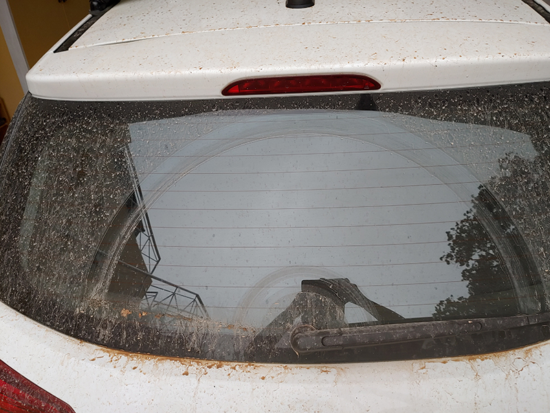Der Schlamm, der gestern Abend vom Himmel fiel, hat seine Spuren hinterlassen. Dabei sind die Bilder noch weit entfernt von der Realität. Heute war deshalb großes Putzen angesagt, denn das Zeug ist hartnäckig und lässt sich – erstmal trocken – nur schwer von Putz, Fenstern, Fliesen, Möbeln und Textilien oder Fahrzeugen entfernen. Es dauerte Stunden, ehe die terrakottafarbene Pampe halbwegs vom Grundstück verschwand. Da müssen wir morgen nochmal ran.