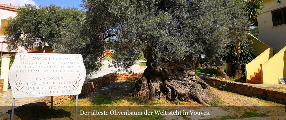 Rund 20 Millionen Olivenbäume soll es auf Kreta geben, bei uns im Nordwesten wohl besonders viele – und gute! Der älteste steht übrigens im Bergdorf Vouves in der Nähe von Kolymbari.