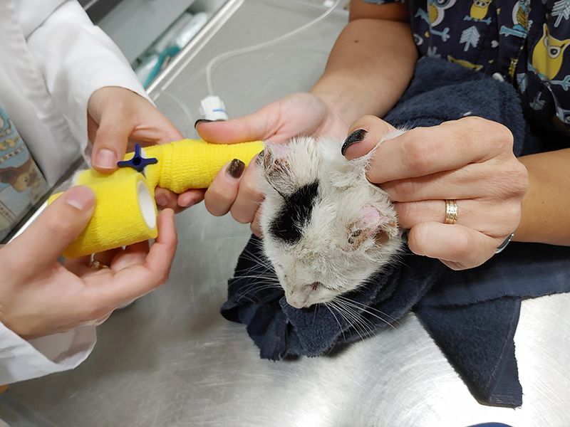 In der Tierarztpraxis von Sofi Terezaki kümmerten sich die Ärztinnen Myrto und Katerina gewissenhaft um den armen kleinen Kater. Sechs Monate wäre er schon alt, fanden sie heraus. Dabei sah er aus, als wären es nur wenige Wochen. Dass er so lange durchhalten konnte, grenzt an ein Wunder. Aber alle seine Werte waren leidlich okay. Auch ansonsten sah es nicht schlecht aus, so dass die Prognose optimistisch war. Der Kater kam an den Tropf und, weil er die Körpertemperatur nicht halten konnte, ins Wärmebett. Beim Anruf am nächsten Tag vereinbarten wir, dass wir ihn am kommenden Nachmittag für die weitere Pflege zu uns nach Hause holen werden. Doch dann fand Myrto ihn morgens tot in seiner Box. Die Obduktion zeigte, dass die Organe okay waren. Der Kleine war wohl einfach zu schwach.