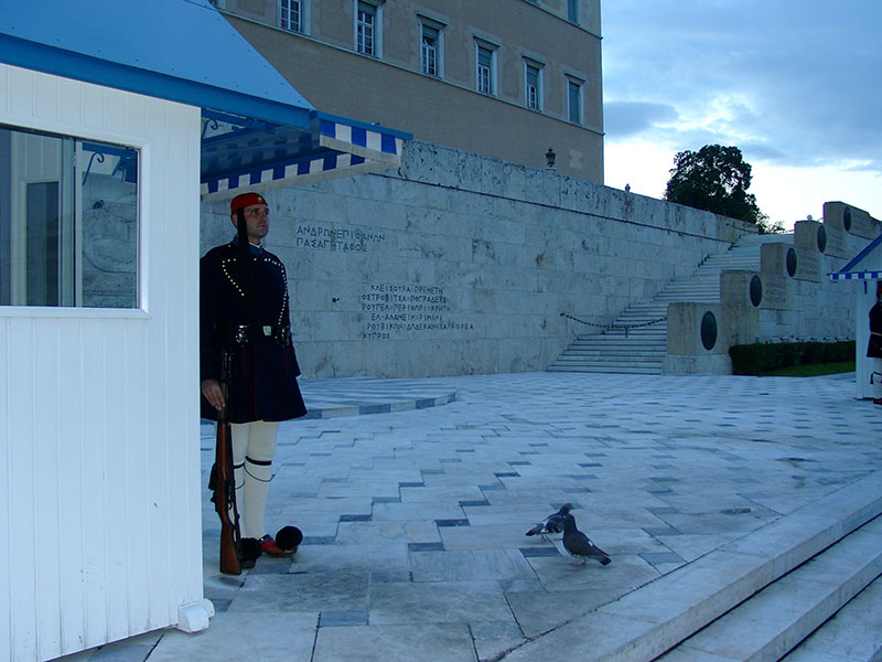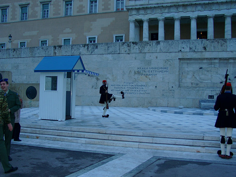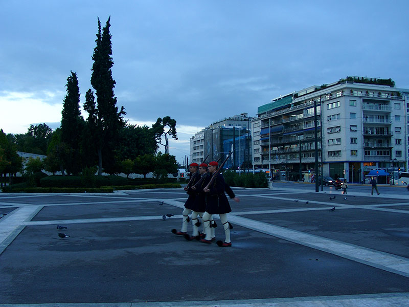 Auf dem Rückweg nach Berlin konnten wir uns in Athen umsehen. Die Fähre legte pünktlich um sechs Uhr früh in Piräus an. In der Metrostation Monastiraki hatte ich schon auf der Hinfahrt Schließfächer entdeckt. So früh am Morgen waren zum Glück noch Fächer frei. Befreit von unserem Gepäck kamen wir gerade rechtzeitig zur Wachablösung auf dem Syntagma-Platz (Platz der Verfassung) im Zentrum der griechischen Hauptstadt an. Leider war es noch etwas zu dunkel für schöne Fotos … Dann ging’s auf direktem Weg zur Akropolis.
