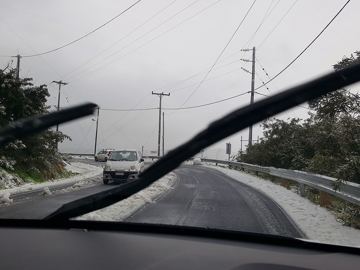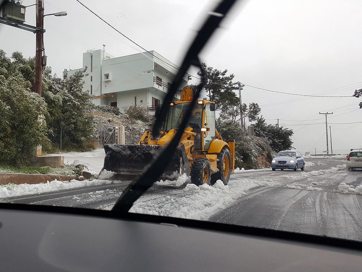 Dass die Lage ernst war an diesem 8. Januar, merkte man auch an den Kraftfahrern. Die sonst so verwegenen Kreter waren plötzlich höchst verhalten unterwegs. Selbst die Taxifahrer fuhren auf dem kurvigen Weg vom und zum Airport nur mit maximal 30 Stundenkilometern. Polizeiwagen sicherten Gefahrenstellen und die Arbeit der Räumfahrzeuge.